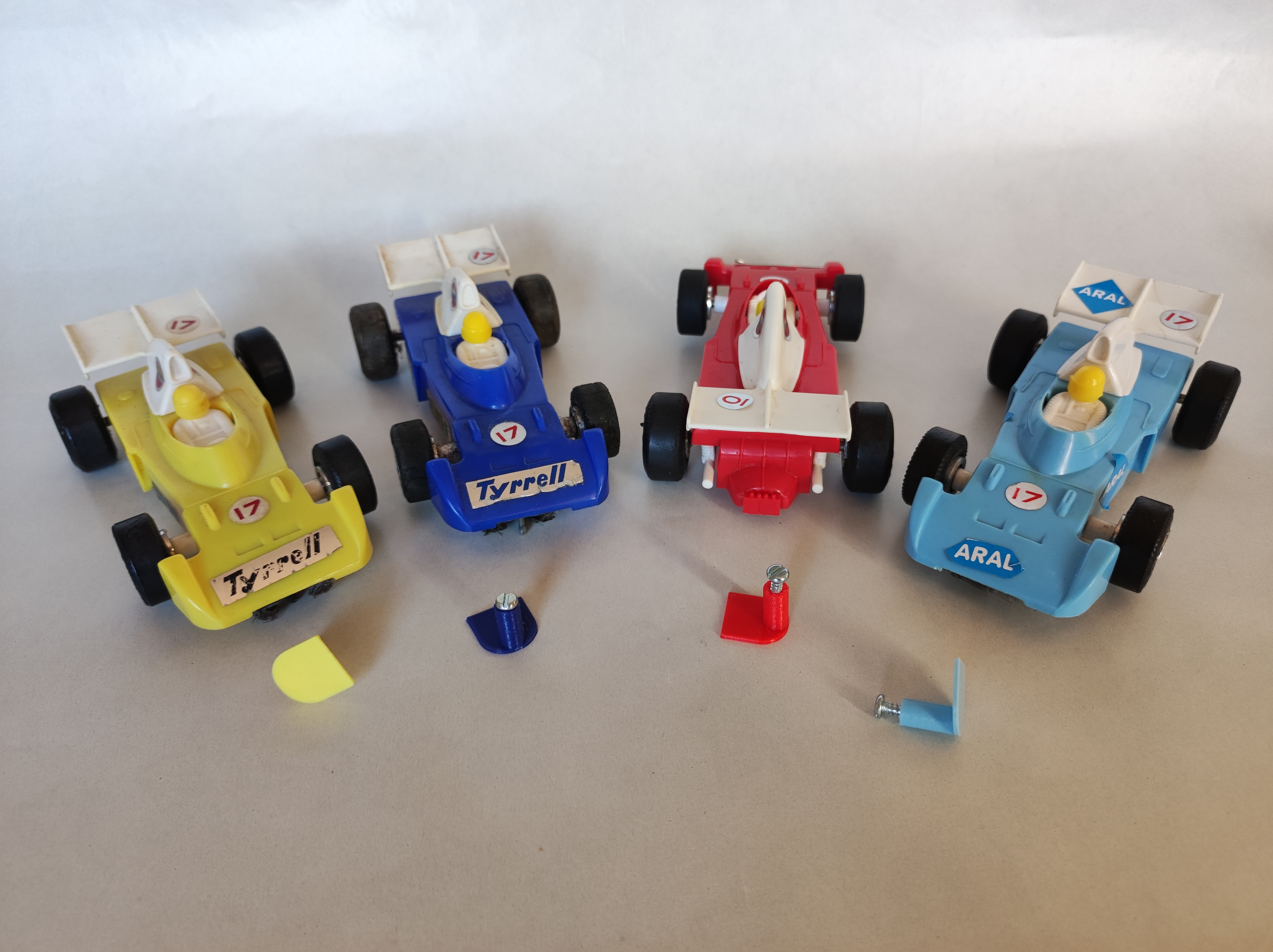 Vyrobeno 3D tiskem. Pro auta Tyrrell.Uchycení podvozku šroubkem ke karoserii.Barva: červená, světle modrá, tmavě modrá, žlutá celý popis