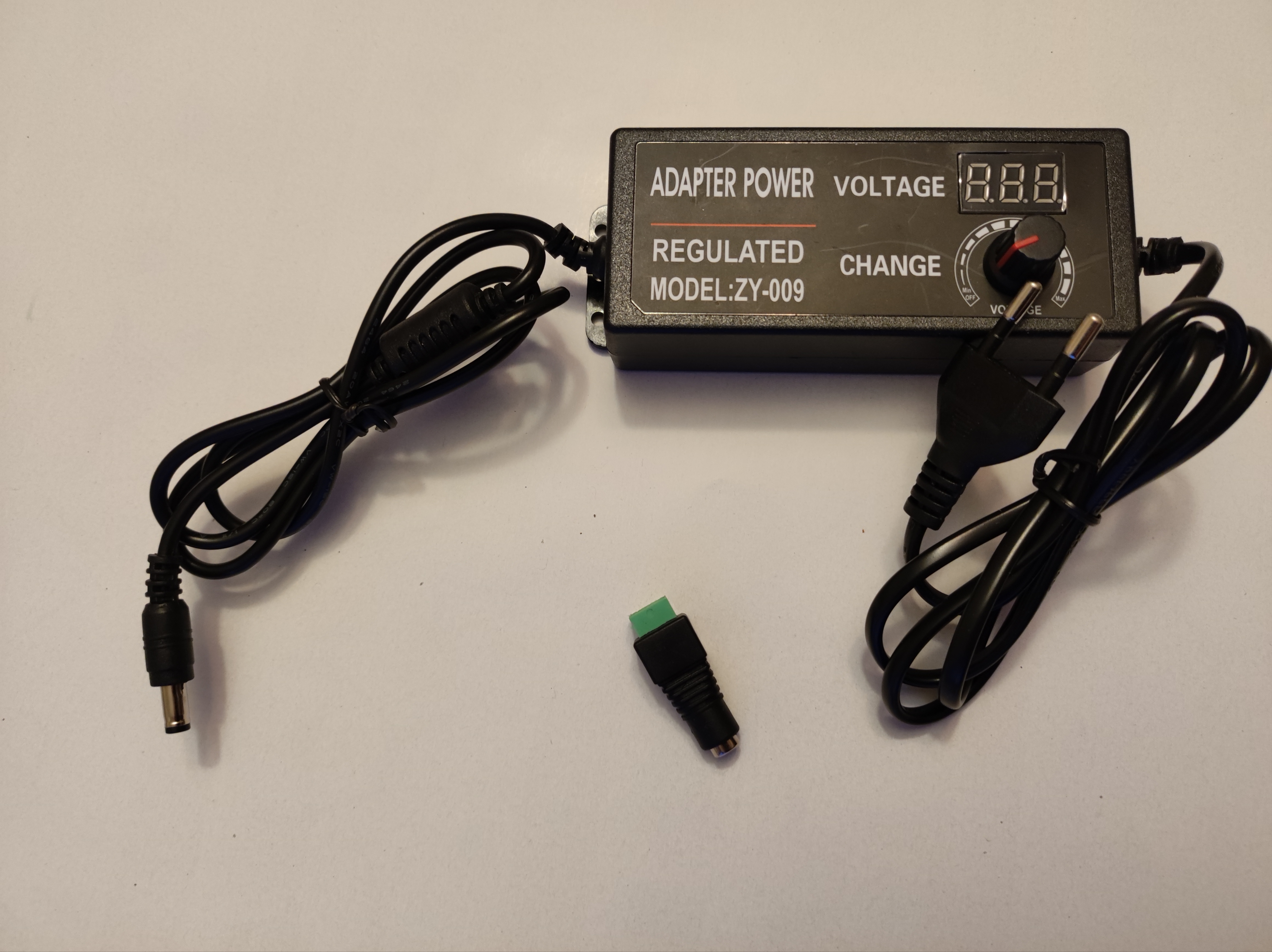 Napáječ má výstupní kulatý konektor 5,5/2,5 mm. Do přiložené konektoru se svorkovnicí zapojíte připojovací kabel a propojíte s přípojným dílem (originální plíšky jsou moc široké a do svorkovnice se nevejdou, je potřeba je upravit nebo uštípnout)
